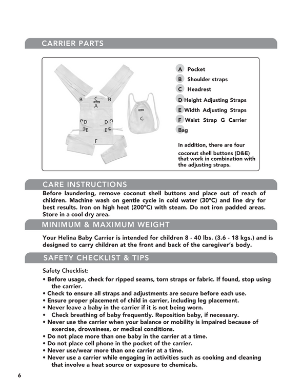 We are so excited for you to get started with carrying your little with you Helina Baby Carrier. Enclosed with your carrier is a copy of the manual but in case you are without it for any reason, we wanted to make sure that you have access to the information for the carrier.